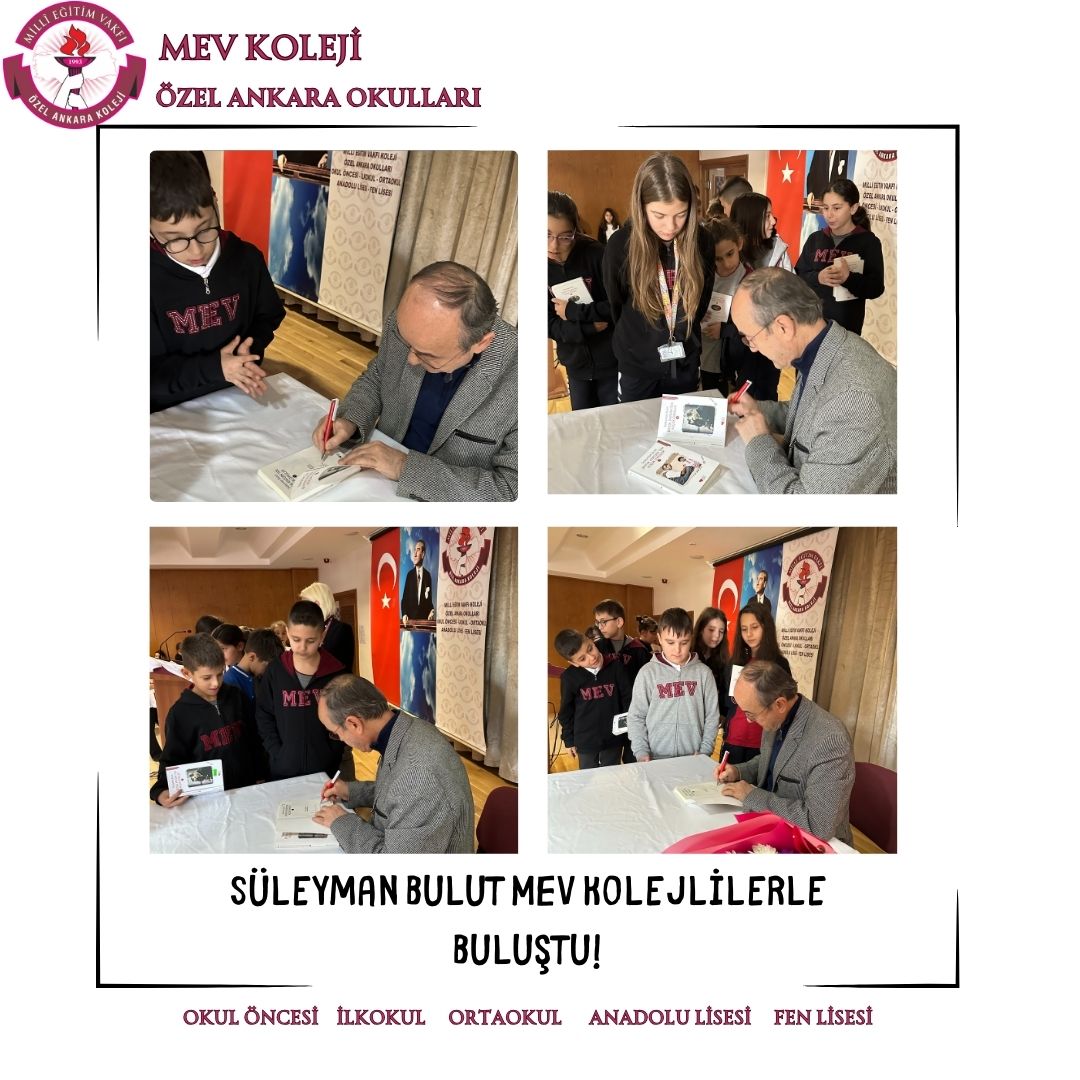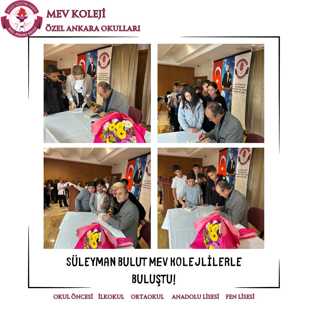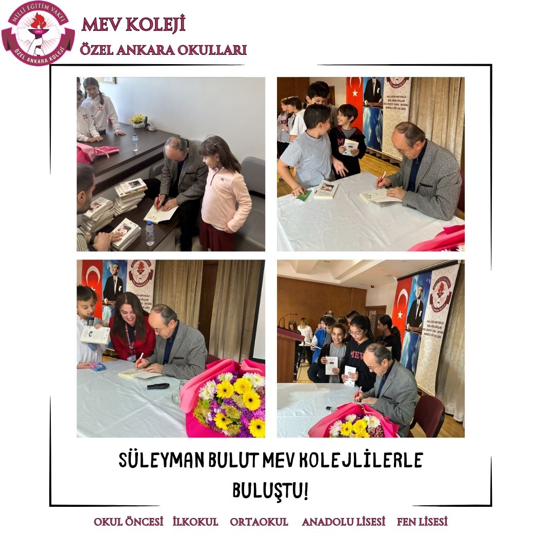 Hayatını dilimizin zengin söz varlığı ve asırlık cumhuriyetimizin kurucusu Ulu Önderimiz Mustafa Kemal Atatürk’ü anlatmaya adayan çok değerli yazarımız Sayın Süleyman Bulut 3 Aralık Salı günü 4 ve 5.sınıflarımızla buluştu. Ata’mızın hayatından sunduğu kesitlerle; çocuk, öğrenci, asker ve lider Mustafa Kemal’i birbirinden güzel hikayelerle anlattı. Son derece etkili ve duygu yüklü söyleşinin ardından Sayın Bulut, MEV Kolejli okurların ilgisinden memnun kalarak okulumuzdan ayrıldı.