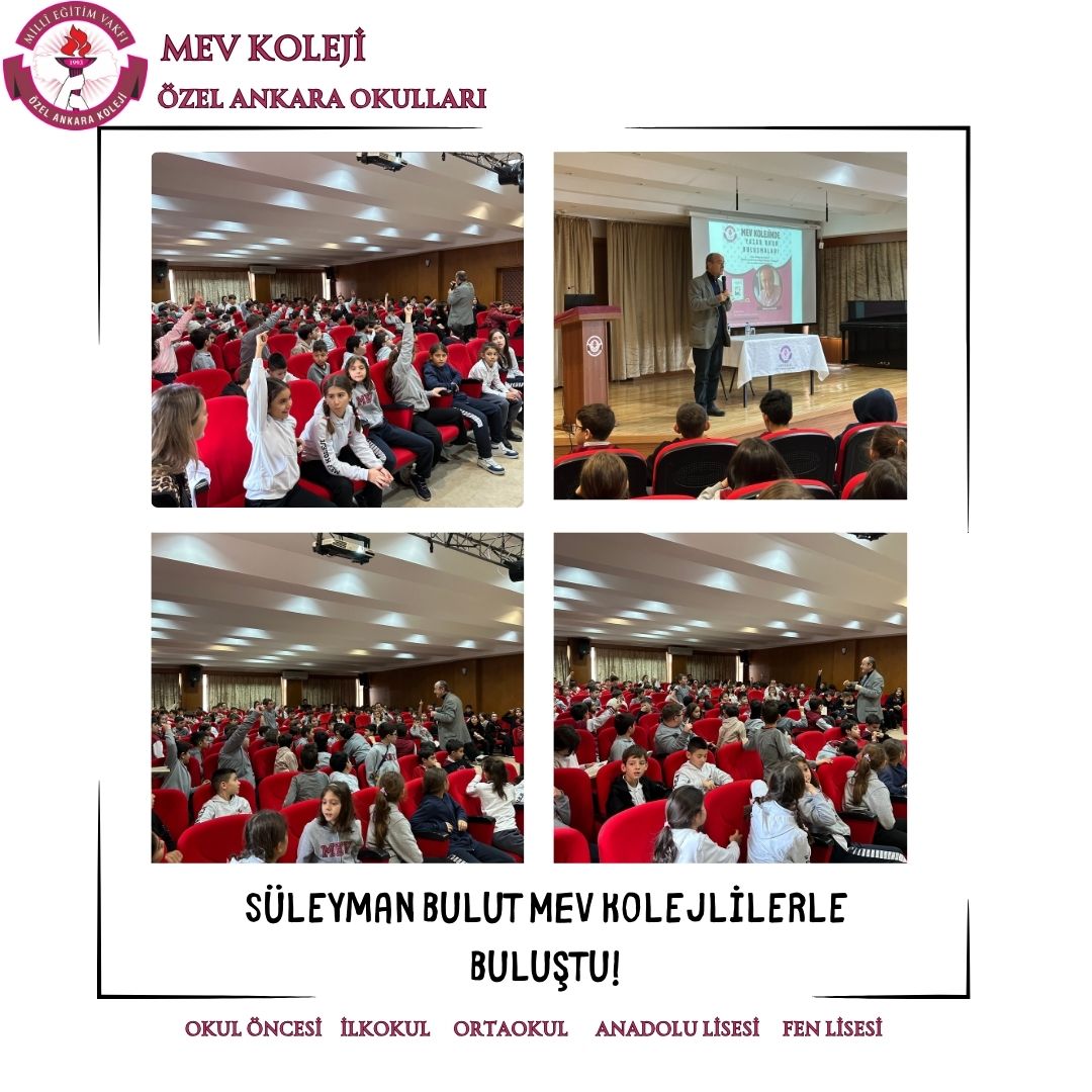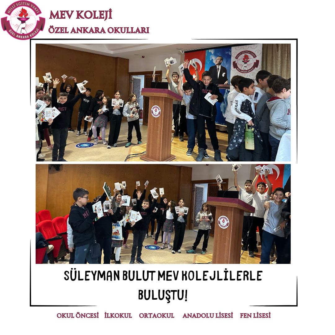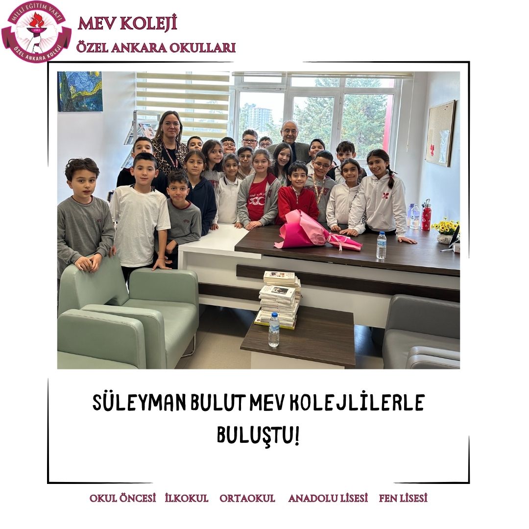 Hayatını dilimizin zengin söz varlığı ve asırlık cumhuriyetimizin kurucusu Ulu Önderimiz Mustafa Kemal Atatürk’ü anlatmaya adayan çok değerli yazarımız Sayın Süleyman Bulut 3 Aralık Salı günü 4 ve 5.sınıflarımızla buluştu. Ata’mızın hayatından sunduğu kesitlerle; çocuk, öğrenci, asker ve lider Mustafa Kemal’i birbirinden güzel hikayelerle anlattı. Son derece etkili ve duygu yüklü söyleşinin ardından Sayın Bulut, MEV Kolejli okurların ilgisinden memnun kalarak okulumuzdan ayrıldı.